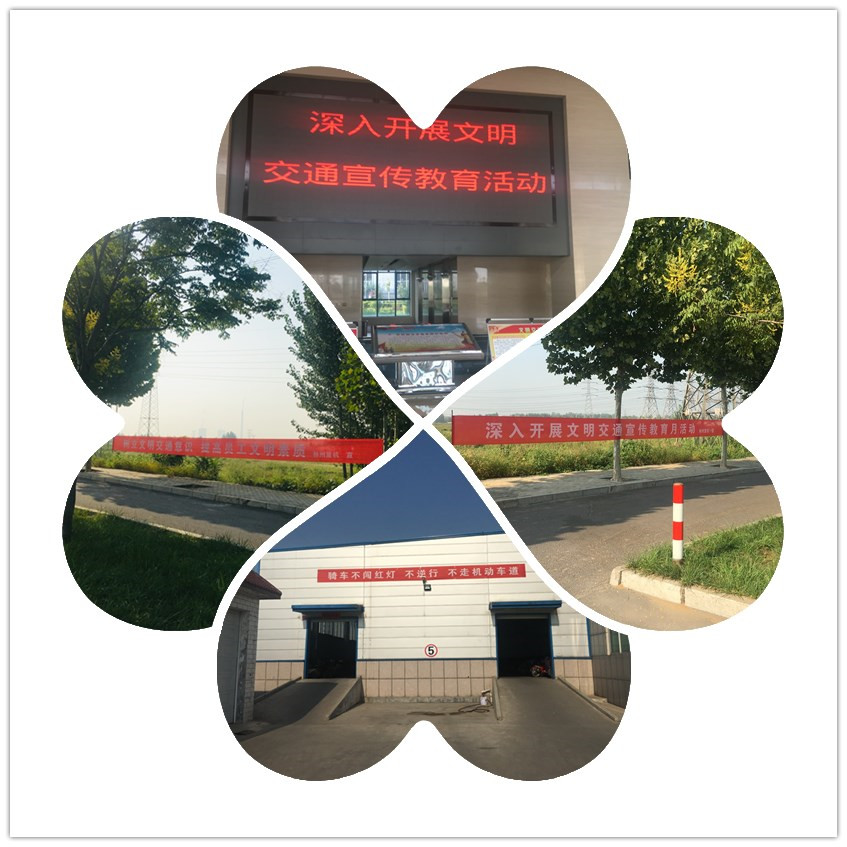 懸掛文明交通宣傳標(biāo)語,營造濃厚的宣傳氛圍。公司在廠區(qū)門口對面及存車棚外等懸掛文明交通宣傳教育標(biāo)語,使員工在上下班路上抬頭就可以看到醒目的標(biāo)語,特別是在存車棚處時(shí)刻提醒員工“騎車不闖紅燈、不逆行、不走機(jī)動(dòng)車道”。通過懸掛標(biāo)語,營造了濃厚的文明交通宣傳教育氛圍。