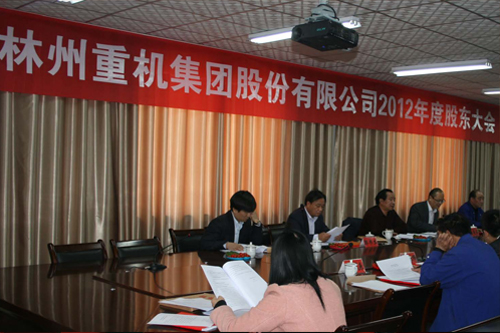 2013年4月16日下午14時,林州重機(jī)集團(tuán)股份有限公司2012年度股東大會在公司一樓會議室以現(xiàn)場投票和網(wǎng)絡(luò)投票相結(jié)合的方式召開,參加本次股東大會的股東及股東代表共24人,代表公司股份328,572,401股,占公司有表決權(quán)股份總數(shù)的61.0356%,其中,現(xiàn)場出席會議的股東及股東代表14人,代表股份328,309,380 股,占公司有表決權(quán)股份總數(shù)的60.9867%;通過網(wǎng)絡(luò)投票方式參加會議的股東10人,代表股份263,021股,占公司有表決權(quán)股份總數(shù)的0.0489%。